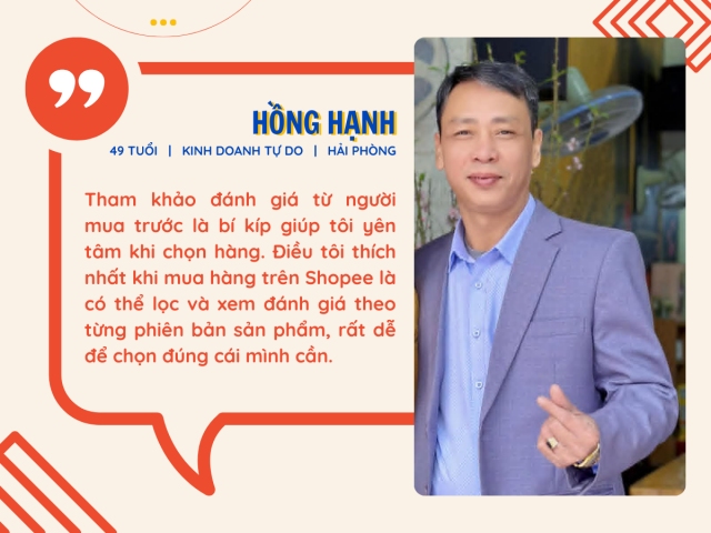 Anh Hạnh chia sẻ: “Mỗi tùy chọn về công suất, chức năng hay kích cỡ của các sản phẩm đều có sự khác biệt khá lớn khi sử dụng thực tế. Đọc kỹ đánh giá, nhất là những đánh giá đã được phân loại theo từng tùy chọn giúp tôi mua đúng loại sản phẩm mình cần và tiết kiệm thêm nhiều thời gian mỗi khi mua sắm trên sàn. Hiện tại tôi thấy Shopee đã cập nhật tính năng phân loại này, việc lọc đánh giá giờ đây rất đơn giản chỉ với vài thao tác.”