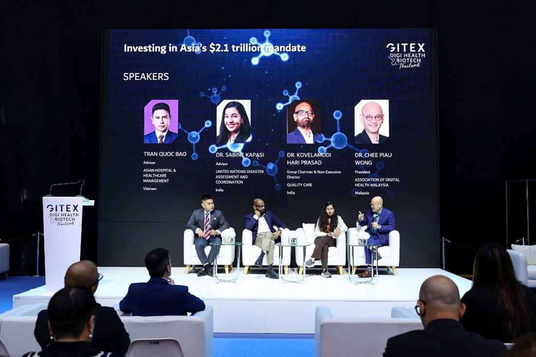 Ông Trần Quốc Bảo, diễn giả chính tại Gitex DigiHealth & Biotech 2025 phát biểu khai mạc về tiềm năng đầu tư y tế châu Á trị giá 2.000 tỷ USD.