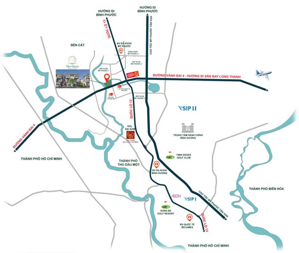 The Oasis Riverside tọa lạc tại mặt tiền đường Vành đai 4 - Đông Bắc TPHCM, với bối cảnh sát nhập tam giác phát triển TP.HCM – Bình Dương – Bà Rịa Vũng Tàu, The Oasis Riverside nổi bật như một điểm nhấn chiến lược. Nằm ngay cửa ngõ phía Bắc TP.HCM, dự án không chỉ thừa hưởng hạ tầng kết nối trọng điểm như Vành đai 4, Quốc lộ 13, mà còn hưởng lợi trực tiếp từ làn sóng dịch chuyển dòng vốn, công nghiệp và dân cư về khu vực, đặc biệt với các dự án sắp được triển khai bởi chủ đầu tư lớn như Sun Group, đón đầu xu hướng mở rộng đô thị mới.